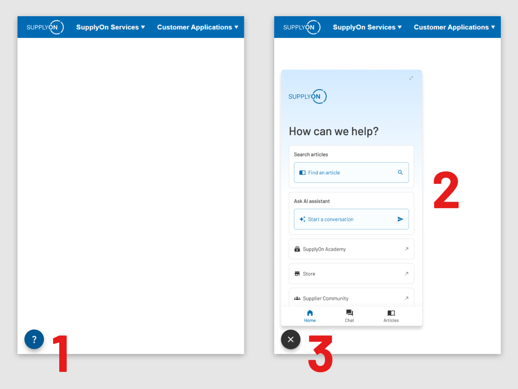 In selected SupplyOn solutions, the Help Panel also includes an integrated AI Assistant (chatbot) that answers user questions directly in real time.